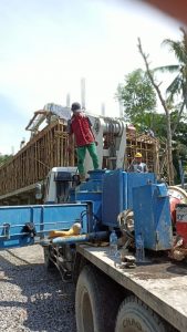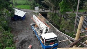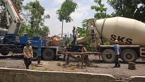 7 truk molen datang silih berganti dengan belalai truk pompa menyalurkan adonan semen ke semua tempat yang diarahkan petugas yang membimbing pekerja meratakan adonan semenselanjutnya petugas vibrator menekan adonan cor dengan tiupan alat pompanya agar masuk ke semua sela kerangka besi beton.